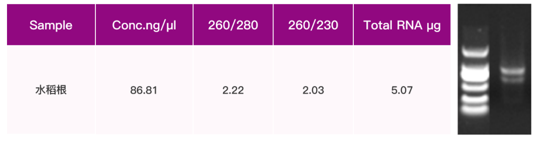 取60 mg 万寿菊花瓣,使用TIANGEN TGuide Smart 高效多糖多酚植物总RNA提取试剂盒(DP672),整合TIANGEN TGuide S16 全自动核酸提取纯化仪(OSE-S16)提取总RNA,100 μl 洗脱。与品牌A 多糖多酚柱法手工提取试剂盒进行平行实验。