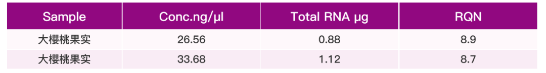 取60 mg 大樱桃果实,使用TIANGEN 磁珠法高效多糖多酚植物总RNA提取试剂盒(DP772),整合自动化核酸提取仪提取总RNA, 100 μl 洗脱。