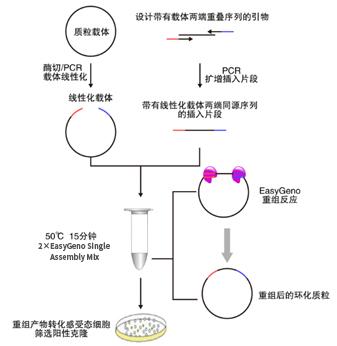 EasyGeno单片段重组克隆试剂盒基于DNA序列同源性进行片段重组,可快速将单个片段定向克隆到任意线性化载体中。通过精心设计和严格试验,本试剂盒含有的2×EasyGeno Single Assembly Mix具有的酶活性可将载体和片段的同源区域从双链的3’端进行重组连接,最终得到的无缺口闭环质粒可直接转化感受态细胞筛选克隆。该方案克服了酶切位点的限制,仅需在插入片段PCR引物5’端引入线性化载体的末端序列,使得插入片段5’和3’两端带有载体两端的一致性序列(15-25 bp),即可实现插入片段的定向重组进入载体。重组反应可在恒温条件下快速进行(50 ℃处理15 min),配合灵活的PCR产物处理方式和快速转化方法,数小时内即可完成从DNA样品准备到重组产物的转化涂板培养的全部操作。