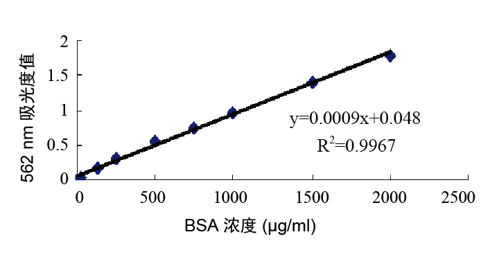 h 内即可完成蛋白质定量检测。本试剂盒含有牛血清白蛋白(BSA)溶液作为蛋白质标准溶液,测定范围为 20-2000 µg/ml。