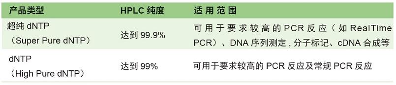 ■ 超纯 dNTP /dNTPs (10 mM each) :是 dATP、dGTP、dCTP、dTTP 的等摩尔混合物,按实验需要,直接用适当的缓冲液稀释即可使用。作为 PCR 反应底物时,请用无菌超纯水稀释成适当浓度使用。