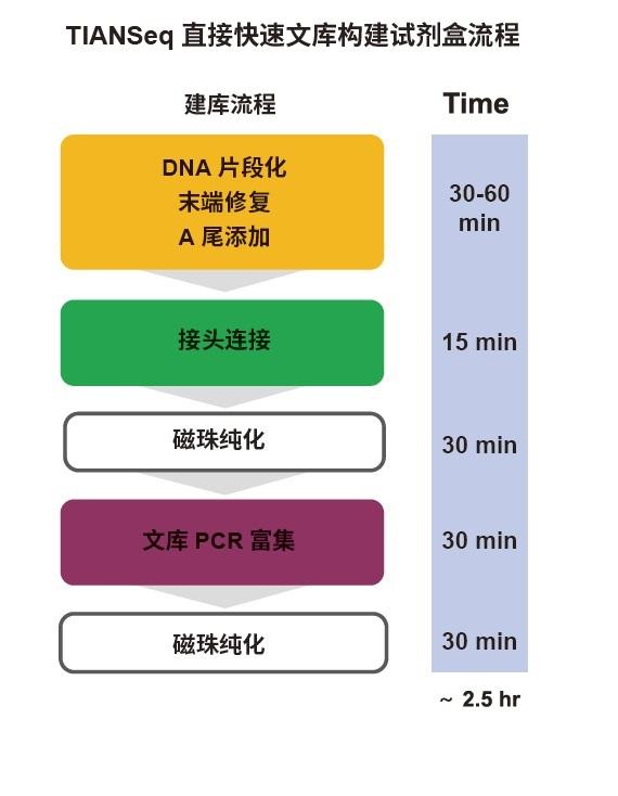 TIANSeq DirectFast Library Kit(Illumina) 是专门针对于Illumina 高通量测序平台所优化的 DNA 文库构建试剂盒。本试剂盒实现了 DNA 片段化、末端修复和 3’端 dA 尾添加在一管内一步法完成,同时所得产物无需纯化,可直接用于 adapter 的连接。另外,本试剂盒配备的 PCR 扩增试剂经过专门的优化,扩增所得 DNA 序列产量高,保真度好、无碱基偏好性。本产品采用一步法的反应流程,省去了多步纯化步骤,整个建库流程仅需 2.5 hr;文库转化效率更高,可对微量 DNA 样本进行高效的文库构建。